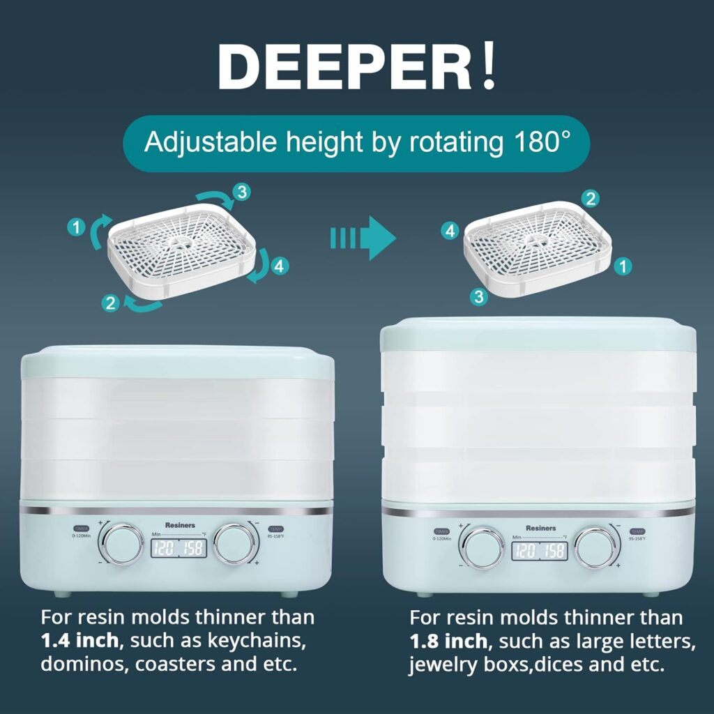 - Deeper Trays for Efficient Curing: Resiners takes resin curing to the next level with the introduction of deeper trays. These trays are thoughtfully designed to accommodate a variety of molds, including jewelry molds, domino molds, and more. The adjustable height between each tray, ranging from 1.4″ to 1.8″, allows for optimal flexibility in curing arrangements.